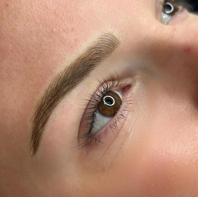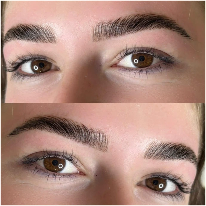 Brow lamination involves straightening and lifting the hairs using a chemical solution, which allows the hairs to have more flexibility to move them into your desired shape, therefore covering any gaps or stray areas.